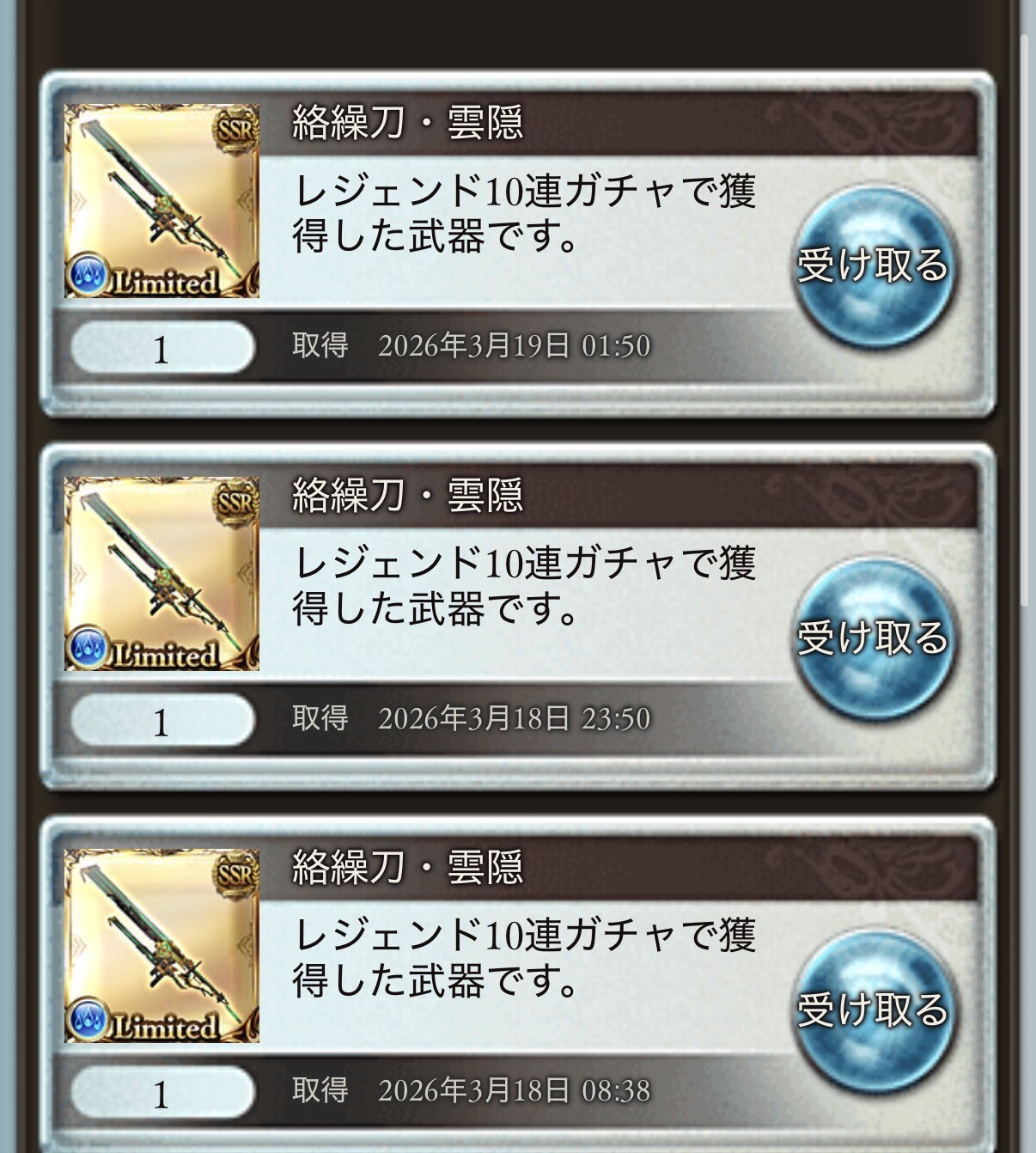 天井はバイシュラに。ssrの数で見たら確率通りくらいだけど絡繰刀めっちゃ出たから上振れ