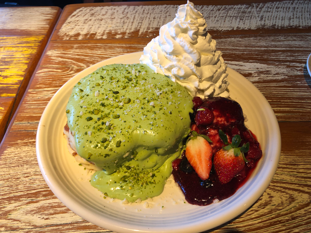 ハニーマスタード餅粉チキンとピスタチオフォンダンショコラパンケーキでした3段のパンケーキを切ったらチョコソースが流れてくる新体験に動揺が隠せなかった
