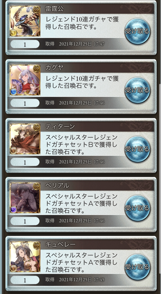 スタレは安定の完凸済み石でしたSSR率はスタレ確定分抜いて考えてもPUも仕事してていい感じなのではないかなとカグヤ嬉しいただ狙ってたクリタイル武器とクリスリアが出なかったのは残念