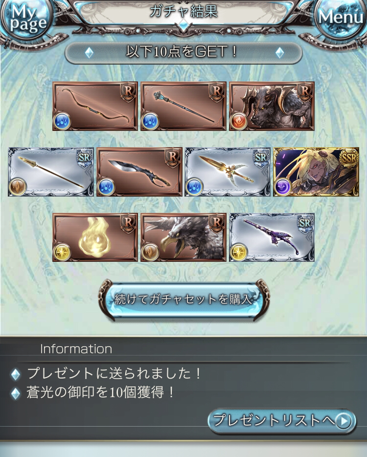 SSR 19個で大体確率通り道中イーウィヤが出た時は「PUはどうしたよPUは!!」って思ってしまいました(未所持だったのでありがたいですが)あとベリアルは昨日服脱いで来てくれ